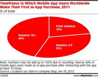 移動應(yīng)用分析公司Localytics提供的數(shù)據(jù)顯示,增加應(yīng)用粘性對用戶重復(fù)訪問應(yīng)用以及經(jīng)常性參與應(yīng)用內(nèi)置支付非常重要。舉例而言,連續(xù)數(shù)天玩一款手機(jī)游戲的玩家,比不經(jīng)常玩這款游戲的玩家更可能購買游戲附加的內(nèi)容或功能。Localytics的研究結(jié)果表明,忠實的應(yīng)用用戶比平均用戶使用應(yīng)用內(nèi)置支付高出25%。Localytics的數(shù)據(jù)還表明,44%的智能手機(jī)用戶只有與應(yīng)用互動10次以上,才會使用應(yīng)用內(nèi)置支付。該調(diào)查還顯示,在應(yīng)用發(fā)布12天開始,便會有用戶使用應(yīng)用內(nèi)置支付。