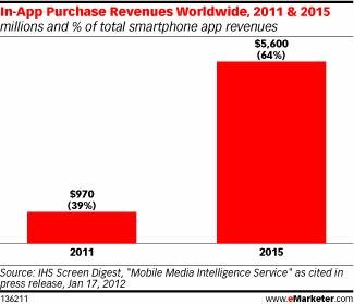 IHS Screen Digest預(yù)計,應(yīng)用內(nèi)置支付將成為移動應(yīng)用營收的新標(biāo)準(zhǔn)。游戲開發(fā)商共同通過向用戶提供免費應(yīng)用下載服務(wù),然后向用戶進(jìn)入新層次內(nèi)容收取費用已證明這種“免費增值”模式非常的成功。IHS Screen Digest預(yù)計,到2015年,應(yīng)用內(nèi)置支付將占據(jù)智能手機(jī)應(yīng)用營收總額的64%,遠(yuǎn)超過2011年的39%。