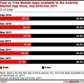 通過對2010年9月至2011年12月Android Market應(yīng)用商店的分析,進(jìn)一步表明了對免費應(yīng)用模式的依賴性。根據(jù)第三方應(yīng)用程序跟蹤服務(wù)AndroLib提供的數(shù)據(jù),2010年9月Android Market應(yīng)用商店下載的大約65%應(yīng)用均為免費應(yīng)用;在2011年12月,這一比例已經(jīng)提升至69%。