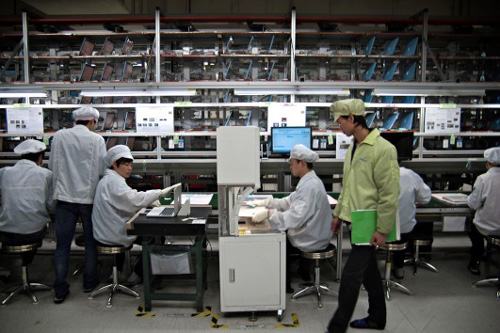 在富士康深圳龍華工廠,一名工人正在檢查Macbook Pro的元件。