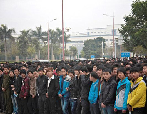 在一個周一上午,約3000名外來工人在深圳的富士康招聘中心門前,希望獲得在富士康的工作機(jī)會。