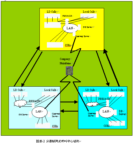 。。"對于客戶或消費者來說,其呼叫中心場所的地理分布為多點式。但采取的接入設(shè)備和技術(shù)手段(包括軟件)等,則為一地集中式接入與統(tǒng)一分配來話。"
