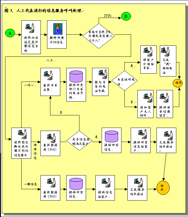 圖3概述了呼叫中心服務(wù)呼叫處理過程。描述了進(jìn)入呼叫中心系統(tǒng)的各種呼叫如何完成處理過程,或者由真人代表完成,或者是通過IVR技術(shù)完成。