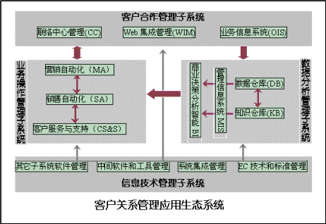 由上述四個子系統(tǒng)組成的客戶關系管理的生態(tài)系統(tǒng),基本的結構和體系可如下圖所示:
