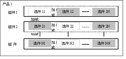 產(chǎn)品是由多個組件組成的,而組件則由多個選件組成。組件可以是有形的(如電腦硬盤)也可以是無形的(如保修期),產(chǎn)品,組件與選件的關系可以由圖6、2、2來說明。