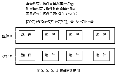 定量原則應用于產(chǎn)品配置,是對所選擇選件的各種量的規(guī)定。比如,組件內(nèi)選件數(shù)量的最少或最高原則,或選件重量總和的最大最小原則等,是定義在組件層面的約束,如圖2、2、2、4所示。
