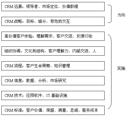 對于大多數(shù)公司而言,一個產(chǎn)品戰(zhàn)略很好理解。但是CRM戰(zhàn)略卻不太讓人理解。這是因?yàn)樵贑RM產(chǎn)業(yè)界、學(xué)術(shù)界對"CRM是什么"、"CRM戰(zhàn)略由什么組成"還沒有達(dá)成共識。因此,以下所闡述的CRM戰(zhàn)略并不一定勝人一籌,但我們會努力全面論述CRM戰(zhàn)略框架。我們認(rèn)為一個CRM戰(zhàn)略必須包括以下幾個內(nèi)容:定義價值前提、定義客戶戰(zhàn)略、企業(yè)變革計(jì)劃。