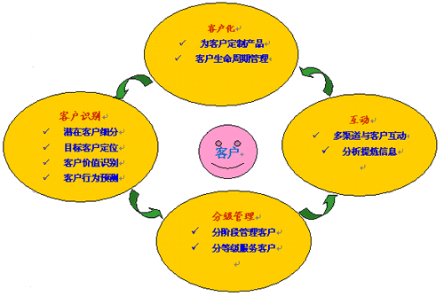 流程涉及到客戶生命周期管理、知識管理的流程。具體來說,流程涉及到兩大方面,其一,CRM成功實(shí)施后的企業(yè),應(yīng)該在業(yè)務(wù)流程上一個變革。企業(yè)各個部門開展業(yè)務(wù)的共同前提是:以客戶為中心。其二,企業(yè)應(yīng)當(dāng)通過CRM來建立一種客戶管理的優(yōu)化流程,從客戶識別,到分級管理,再到企業(yè)與客戶互動,再到為客戶定制產(chǎn)品;然后循環(huán)往復(fù)。具體我們可以參見下圖: