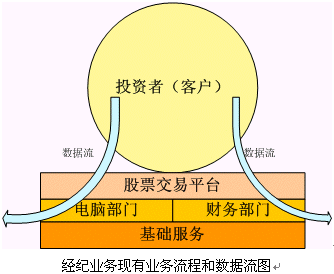 。。從上圖可以看出,現在的證券公司的經紀業(yè)務為各個股民或者說投資者所提供的服務就是交易平臺的服務,也就是交易通道服務。營業(yè)部的其他服務都是為這個交易通道服務,這些服務品種都是非;A的。而營業(yè)部的數據流,也就是各個客戶的基本信息和交易信息,通過電腦部和財務部門就走到了終結,沒有被更好的利用。