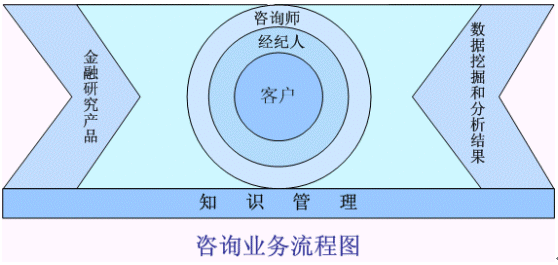 如上圖所示的證券經(jīng)紀(jì)行業(yè)的投資咨詢服務(wù)業(yè)務(wù)流程,是在整體的知識(shí)管理的平臺(tái)之上,根據(jù)金融產(chǎn)品的信息通道和數(shù)據(jù)分析和挖掘的基礎(chǔ),由咨詢師和經(jīng)紀(jì)人組成可行性的個(gè)性化服務(wù)小組為核心客戶提供真正的"一對(duì)一"投資設(shè)計(jì)和投資咨詢服務(wù)。