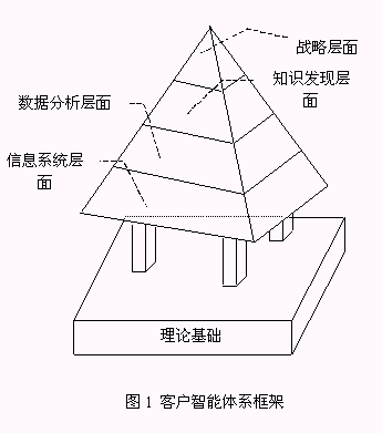 客戶智能系統(tǒng)(CI System)是本文提出的實現(xiàn)客戶智能的系統(tǒng)平臺。它包括了客戶智能體系中的信息系統(tǒng)層面、數(shù)據(jù)分析層面、知識發(fā)現(xiàn)層面,是基于客戶智能理論的可操作的系統(tǒng)框架。因此,客戶智能體系也可以簡單地用客戶智能基礎(chǔ)理論和基于客戶智能理論的客戶智能系統(tǒng)兩個邏輯層面表示(圖2)。基于客戶智能的CRM系統(tǒng)是本文描述的客戶智能系統(tǒng)中的一種。