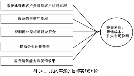 維奧制藥針對(duì)自身特定的業(yè)務(wù)需求,結(jié)合CRM的經(jīng)營(yíng)理念,提出圖24.1所示CRM實(shí)踐的目標(biāo)實(shí)現(xiàn)途經(jīng)。