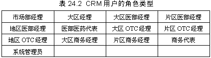 另外,對(duì)CRM系統(tǒng)的用戶也進(jìn)行了明確的定義,按照工作性質(zhì),以及本著能夠快速高效地共享信息,提高銷售能力和工作效率的原則,確定表24.2所示的CRM用戶的角色類型。