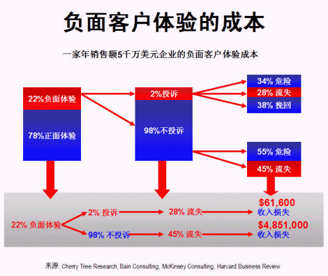 一家年銷售額五千萬美元的企業(yè),假設正面客戶體驗為78%,負面體驗為22%,在所有負面體驗中,只有2%的客戶投訴,其余98%大多數均不投訴,保持沉默(這與現實情況頗為吻合)。在2%投訴客戶中,有34%經過處理仍然未能令客戶完全滿意,尚有流失的危險;28%的客戶在處理后依然流失,余下38%的客戶則感到滿意,繼續(xù)留下。對大部分(98%)沒有投訴的客戶,因公司對他們的不滿意并不知情,所以沒有采取行動,55%的客戶有隨時流失的危險,其余45%已經流失。
