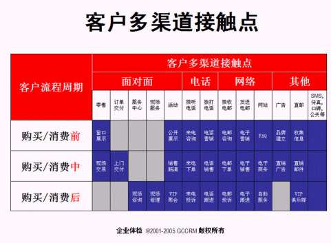 在零售時,消費前就是窗口演示;在消費中就是現場交易。訂單支付就在消費中的上門支付。而服務中心和現場服務這兩個接觸點則發(fā)生在消費后的現場咨詢與現場修理。而活動在購買前就是公開演示、購買中是銷售路演、購買后是VIP聚會。