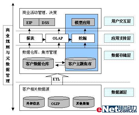從上面的分析型CRM體系結(jié)構(gòu)圖可以看出,整個架構(gòu)分為數(shù)據(jù)源層、數(shù)據(jù)存儲層、應(yīng)用支持層和用戶交互層總共四層。數(shù)據(jù)源層包括了企業(yè)常用信息系統(tǒng)和一些外部系統(tǒng)的數(shù)據(jù)源,比如涉及到客戶交互的一些交易系統(tǒng),服務(wù)系統(tǒng),各系統(tǒng)間的客戶數(shù)據(jù)是分散的,而且可能重合,出現(xiàn)不一致的問題;數(shù)據(jù)存儲層是為了整個企業(yè)有集中統(tǒng)一的客戶視圖,通過從各源系統(tǒng)抽取數(shù)據(jù),進(jìn)行整合后的數(shù)據(jù)倉庫,而且在客戶數(shù)據(jù)倉庫的基礎(chǔ)上,可以建立相關(guān)分析之用的客戶主題數(shù)據(jù)集市;應(yīng)用支持層除了支持復(fù)雜,智能化報表查詢外,還支持OLAP分析,提供數(shù)據(jù)挖掘功能;用戶交互層提供分析和挖掘結(jié)果同企業(yè)管理、決策層和企業(yè)其它服務(wù)人員和客戶的交互,形成反饋機(jī)制,從而有效地利用分析和挖掘得到的有用知識。