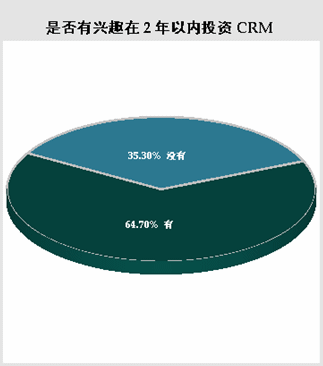 在選擇“尚未使用任一CRM軟件”的被調(diào)查者中,當被問及基于現(xiàn)在的狀況,“是否有興趣在兩年以內(nèi)投資CRM”。有64.70%的被調(diào)查者選擇有興趣在兩年內(nèi)投資CRM軟件,而選擇沒有興趣在兩年內(nèi)投資CRM軟件的只占35.30%。盡管現(xiàn)在實際使用CRM軟件的用戶所占比例還不甚理想,但市場前景還是非?春,大部分公司具有實施CRM軟件的需求。