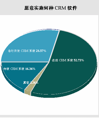 CRM軟件,或在線CRM軟件”;也有28.57%的被調(diào)查者選擇自行開發(fā)CRM軟件;相比于前面兩種類型,被調(diào)查者對傳統(tǒng)CRM軟件的需求則處于一個較低的水平,有16.36%的被調(diào)查者仍然選擇有興趣在兩年投資傳統(tǒng)的CRM軟件。雖然ASP的模式在中國市場上的認知度仍然有限,但是市場對on-demand
