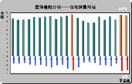 。2)整體差距分析(Gap Analysis)。請見上圖X軸下方所示,計算所有被調(diào)查對所列在線銷售網(wǎng)站的滿意度平均值(綜合最喜歡在線銷售網(wǎng)站和最不喜歡在線銷售網(wǎng)站的滿意度,計算被調(diào)查者對22個子流程的滿意度評分)。通過計算重要性和滿意度的差距,首先,一個有趣的現(xiàn)象,在著色的三個差距最大的子流程剛好也是重要性得分排名前三位的流程S12,