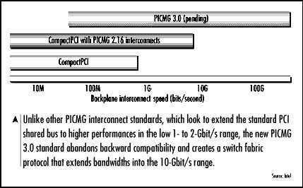 PICMG是CompactPCI的升級(jí)標(biāo)準(zhǔn),但是與CompactPCI有很大的不同,CompactPCI是共享式總線結(jié)構(gòu),而PICMG提供了交換式連接,每個(gè)點(diǎn)到點(diǎn)的連接能達(dá)到10Gbps的帶寬。圖1所示為幾種技術(shù)的互聯(lián)帶寬比較。PICMG標(biāo)準(zhǔn)的提出主要是針對(duì)電信行業(yè)方面的應(yīng)用,因此在供電方面采用了電信界的雙-48V電源標(biāo)準(zhǔn),而非CompactPCI的ATX電源標(biāo)準(zhǔn)。因此,PICMG標(biāo)準(zhǔn)與CompactPCI在很大程度上不兼容。