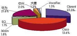 從圖3可以看出, Cisco、Clarent 和華為已經(jīng)成為我國IP電話設(shè)備市場(chǎng)的主要供應(yīng)商。