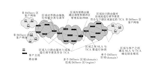 區(qū)分服務(wù)是由綜合服務(wù)(Int-serv )發(fā)展而來(lái)的,它采用了IETF的基于RSVP的服務(wù)分類標(biāo)準(zhǔn),拋棄了分組流沿路節(jié)點(diǎn)上的資源預(yù)留。區(qū)分服務(wù)將會(huì)有效地取代跨越大范圍的RSVP的使用。區(qū)分服務(wù)區(qū)域的主要成員有:核心路由器、邊緣路由器、資源控制器(BB,Bandwidth Broker)。在區(qū)分服務(wù)中,網(wǎng)絡(luò)的邊緣設(shè)備對(duì)每個(gè)分組進(jìn)行分類、標(biāo)記DS域,用DS域來(lái)攜帶IP分組對(duì)服務(wù)的需求信息。在網(wǎng)絡(luò)的核心節(jié)點(diǎn)上,路由器根據(jù)分組頭上的DS碼點(diǎn)(Code Point)選擇碼點(diǎn)所對(duì)應(yīng)的轉(zhuǎn)發(fā)處理。資源控制器BB配置了管理規(guī)則,為客戶分配資源,它可以通過(guò)服務(wù)級(jí)別協(xié)定SLA (Service Level Agreement)與客戶進(jìn)行相互協(xié)調(diào)以分享規(guī)定的帶寬。