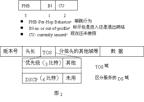QoS的業(yè)務(wù)區(qū)分結(jié)構(gòu)使用IPV4報(bào)頭中的業(yè)務(wù)類型(TOS)字段,并將8位TOS字段重新命名,作為DS字段,其中6位可供目前使用,其余2位以備將來(lái)使用。該字段可以按照預(yù)先確定好的規(guī)則加以定義,使下行節(jié)點(diǎn)通過(guò)識(shí)別這個(gè)字段,獲取足夠的信息來(lái)處理到達(dá)輸入端口的數(shù)據(jù)包并將他們正確地轉(zhuǎn)發(fā)給下一跳的路由器。這里需要注意的是在IPV4網(wǎng)中所定義的TOS字段與在Diff-Serv中的DS字段不同。TOS字段的定義如圖2所示。圖IPV4報(bào)頭中TOS字段定義Diff-Serv充分考慮了IP網(wǎng)絡(luò)本身靈活,可擴(kuò)展性強(qiáng)的特點(diǎn),將復(fù)雜的服務(wù)質(zhì)量保證通過(guò)DS字段轉(zhuǎn)換為先進(jìn)的單跳行為,從而大大減少了信令的工作。