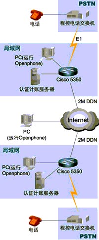 組成這個IP電話的網(wǎng)絡系統(tǒng)由處于兩個不同國家的區(qū)域組成(見附圖1網(wǎng)絡拓撲結構),每個區(qū)域都采用了一臺Cisco 5350路由器(以下簡稱5350)作為網(wǎng)絡的核心,這臺5350路由器具有兩個WAN口和兩個以太網(wǎng)口,能夠直接連接到本地的局域網(wǎng)和DDN基帶調制解調器。和普通電話網(wǎng)絡(PSTN)相連接則是通過添加一個E1接口卡4PRI和一個IP語音數(shù)據(jù)處理單元NP60,來實現(xiàn)E1(30條ISDN的B信道)和路由器相連接,實時地對語音數(shù)據(jù)進行H.323壓縮編碼。
