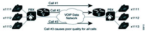 網(wǎng)絡(luò)中,話音網(wǎng)關(guān)路由器并不了解網(wǎng)絡(luò)中的狀況,包括:網(wǎng)絡(luò)的鏈路資源是否已經(jīng)飽和及網(wǎng)絡(luò)延遲,丟包率和網(wǎng)絡(luò)抖動(dòng)等參數(shù)是否可以滿足話音應(yīng)用的需求。如果在不能夠保證網(wǎng)絡(luò)可以提供足夠的資源保證話音質(zhì)量的情況下,建立新的通話鏈路可能影響已經(jīng)建立的鏈路,或者是降低所有的通話話音質(zhì)量。如圖三,如果廣域網(wǎng)的帶寬只能容納兩個(gè)語音的呼叫,第三個(gè)呼叫的建立會(huì)導(dǎo)致所有的呼叫質(zhì)量下降。在這種情況下,拒絕呼叫的建立好過建立一條沒有質(zhì)量保證的鏈路。