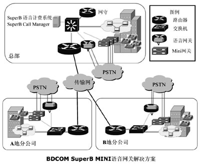 根據西北石油公司各地分公司電話全部是PSTN直線電話,沒有單位內部的PBX,不能通過語音網關把這些直線電話統(tǒng)一接入到IP網絡上這一實際情況,方案提供方博達公司提供了一款小型BDCOM SuperB Mini語音網關,來解決PSTN程控電話統(tǒng)一接入IP語音網絡的問題。使用BDCOM SuperB Mini并結合西北石油公司組建的企業(yè)內部VoIP網絡,克服了傳統(tǒng)語音網關解決方案的不足和缺點。