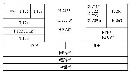為網(wǎng)絡(luò)電話和可視電話會議系統(tǒng)的進一步發(fā)展和系統(tǒng)的兼容性提供了良好的條件。其中系統(tǒng)控制協(xié)議包括H.323、H.245、和H.225.0,Q.931和RTP/RTCP是H.225.0的主要組成部份。系統(tǒng)控制是H.323終端的核心。整個系統(tǒng)控制由H.245控制信道、H.225.0呼叫信令信道和RAS(注冊、許可、狀態(tài))信道提供,音頻編解碼協(xié)議包括G.711協(xié)議(必選)、G.722、G.723.1、G.728、G.729等協(xié)議。編碼器使用的音頻標準必須由H.245協(xié)議協(xié)商確定。H.323終端應(yīng)由對本身所具有的音頻編解碼能力進行非對稱操作。如以G.711發(fā)送,以G.729接收。視頻編解碼協(xié)議主要包括H.261協(xié)議(必選)和H.263協(xié)議。H.323系統(tǒng)中視頻功能是可選的。數(shù)據(jù)會議功能也是可選的,其標準是多媒體會議數(shù)據(jù)協(xié)議T.120。其結(jié)構(gòu)如圖所示。
