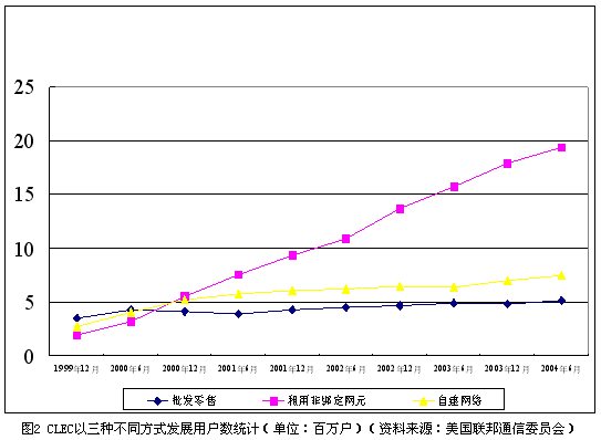 從經(jīng)營模式上看,本地非主導(dǎo)運(yùn)營商的商業(yè)模式在過去的5年中發(fā)生了很大變化。在市場剛剛開始引入競爭的1999年,42.9%的本地非主導(dǎo)運(yùn)營商選擇了批發(fā)零售這種進(jìn)入門檻相對較低的商業(yè)模式,本地電話市場一度活躍著大量地區(qū)性的小運(yùn)營商。由于面臨本地主導(dǎo)運(yùn)營商的強(qiáng)烈抵制,非綁定網(wǎng)元政策的實施自公布以來一再推遲,經(jīng)過反復(fù)的法律訴訟,美國最高法院在2002年最終裁定非綁定網(wǎng)元政策合法。自那時起,AT&T、MCI等全國性的長途電話運(yùn)營商紛紛通過租用非綁定網(wǎng)元的方式進(jìn)入本地電話市場。截止到2004年6月,本地主導(dǎo)運(yùn)營商已經(jīng)提供了約2150萬線非綁定本地用戶線給本地非主導(dǎo)運(yùn)營商。CLEC以三種方式發(fā)展用戶的情況如圖2所示。