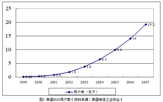 與此同時,Qwest也開始在明尼蘇達(dá)州提供類似的VoIP業(yè)務(wù),并計劃在近期內(nèi)推向全國。Verizon與北電網(wǎng)絡(luò)簽訂了大筆的訂單,計劃全面改造其本地電話網(wǎng)絡(luò)提供的VoIP業(yè)務(wù)。一些曾經(jīng)著名的網(wǎng)絡(luò)電話公司(如Net2Phone)也開始進(jìn)入傳統(tǒng)電話市場。截止到2004年2月底,Vonage的全I(xiàn)P網(wǎng)絡(luò)已經(jīng)擁有13萬VoIP用戶。據(jù)美國電信工業(yè)協(xié)會預(yù)測,到2007年年末,全美的VoIP用戶將會達(dá)到1920萬戶,如圖3所示。