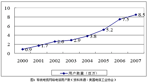 隨著有線電視用戶數(shù)量逐漸達(dá)到飽和,有線電視公司也在積極尋找新的利潤增長點(diǎn)。在過去的7年中,有線電視公司投入了高達(dá)800億美元的資金用于網(wǎng)絡(luò)升級改造,現(xiàn)在,大部分有線電視網(wǎng)絡(luò)已經(jīng)可以提供包括寬帶接入、本地和長途電話、數(shù)字電視、視頻點(diǎn)播等在內(nèi)的一攬子服務(wù)。到2004年末,有線電視公司已經(jīng)擁有超過380萬的本地電話用戶。根據(jù)美國電信工業(yè)協(xié)會的估算,到2007年,全美將會有超過800萬的用戶選擇基于有線電視網(wǎng)的基本電信業(yè)務(wù),如圖4所示。