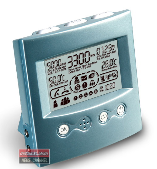 這個裝置,其實是一項早期工具的衍生產(chǎn)品。早在2004年,這個具有獨立顯示屏的小東西被開發(fā)出來,用以控制電腦的超頻設(shè)定并監(jiān)控系統(tǒng)的效能。現(xiàn)在這個在下周起于各大通路都買得到的新機(jī)種已納入Skype話務(wù)管理功能,使用者可直接把頭戴式耳機(jī)接到這個小時鐘上,one-touch輕輕一按,便可立即進(jìn)行接通電話、速簡撥號及電話會議。