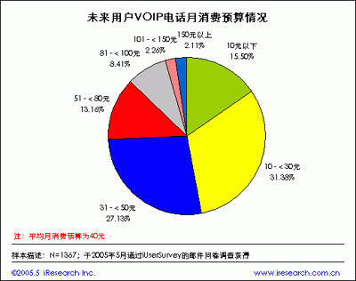 下面再讓我們看看用戶對(duì)網(wǎng)絡(luò)電話消費(fèi)預(yù)算情況,根據(jù)iResearch艾瑞市場(chǎng)咨詢《VOIP報(bào)告》數(shù)據(jù)顯示,月消費(fèi)預(yù)算10元以下的用戶占VOIP用戶的15%,10-30元的占31.3%,31-50元的占27.1%,51-80元的占13.2%,80元以上的占12.8%,據(jù)此計(jì)算未來用戶網(wǎng)絡(luò)電話平均月消費(fèi)預(yù)算為40元。