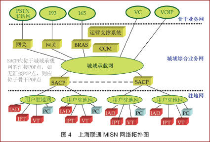 上海聯(lián)通MISN由5個(gè)部分組成(見圖4):(1)業(yè)務(wù)接入控制設(shè)備(SACP)。從用戶駐地網(wǎng)到城域網(wǎng)和骨務(wù)都必須通過SACP接的接入認(rèn)證、業(yè)務(wù)接入控制、網(wǎng)絡(luò)資源管理和服務(wù)質(zhì)量控制等。(2)呼叫管理控制模塊(CCM)。該模塊負(fù)責(zé)對(duì)用戶注冊(cè)的管理;通過SACP對(duì)業(yè)務(wù)接入進(jìn)行認(rèn)證和控制;與骨干業(yè)務(wù)網(wǎng)GK互通,完成各種業(yè)務(wù)的呼叫控制;與SACP一起采集計(jì)費(fèi)信息;負(fù)責(zé)控制語音和視頻媒體流的接入。(3)業(yè)務(wù)網(wǎng)關(guān)。聯(lián)通MISN是基于IP的分組網(wǎng),與基于電路交換的193長(zhǎng)途電話骨干網(wǎng)和本地PSTN市話網(wǎng)互通時(shí),由于媒體層面和控制信令層面都不同,因此,需要通過網(wǎng)關(guān)進(jìn)行互通。(4)BRAS設(shè)備。負(fù)責(zé)將互聯(lián)網(wǎng)接入到165網(wǎng)。(5)業(yè)務(wù)運(yùn)營(yíng)支撐系統(tǒng)。該系統(tǒng)包括維護(hù)網(wǎng)管系統(tǒng)、用戶終端管理系統(tǒng)、用戶管理(業(yè)務(wù)受理、用戶信息管理、用戶業(yè)務(wù)授權(quán)與認(rèn)證)以及本地MISN的計(jì)費(fèi)/營(yíng)賬系統(tǒng),其對(duì)上的接口是各骨干業(yè)務(wù)網(wǎng)的運(yùn)維支撐系統(tǒng)。