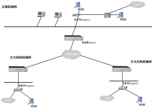 首先將VOIP電話網(wǎng)關(guān)的網(wǎng)絡(luò)接口接入到公司和分部(分公司)的局域網(wǎng)中,通過ADSL、ISDN、撥號(hào)上網(wǎng)等方式,同連接在此因特網(wǎng)上的其它VOIP電話網(wǎng)關(guān)相連,從而將不同地域的電話連接在一起,組成整個(gè)公司的IP電話網(wǎng),如果總部或分部有用戶程控交換機(jī),還可以將VOIP電話網(wǎng)關(guān)接入程控交換機(jī),使得整個(gè)交換機(jī)的分機(jī)都能利用IP網(wǎng)絡(luò)撥打免費(fèi)電話。如果這個(gè)VOIP設(shè)備具有PBX的功能。那么電話網(wǎng)關(guān)的多種接口還可以與電信(PSTN)相連,從而將專網(wǎng)的IP電話語音網(wǎng)與整個(gè)公網(wǎng)銜接成一個(gè)大的電話網(wǎng)絡(luò)。