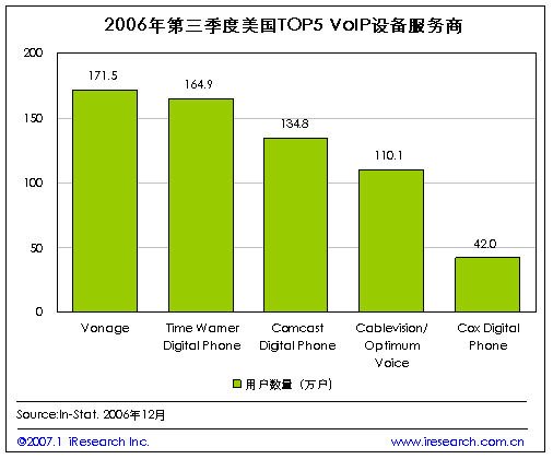 iResearch艾瑞市場(chǎng)咨詢根據(jù)In-Stat的統(tǒng)計(jì)數(shù)字整理發(fā)現(xiàn),目前在美國(guó)VoIP市場(chǎng)中,以VoIP設(shè)備為服務(wù)基礎(chǔ)的服務(wù)提供商的用戶數(shù)量來(lái)看,占市場(chǎng)主導(dǎo)位置的五大服務(wù)商為Vonage、Time Warner、Comcast、Cablevision/Optimum和Cox.