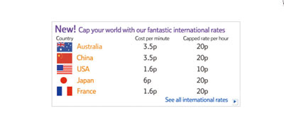 套餐2(BusinessBroadbandVoiceLine Olny):免費接入(通常需要40英鎊),每月5英鎊,本地及國內(nèi)通話資費3.5便士/分鐘,第一個小時通話資費10便士封頂;撥打手機通話優(yōu)惠,1小時通話資費封頂25便士;國際通話優(yōu)惠,不同流向國家的1小時通話資費封頂10或20便士,如圖3所示。