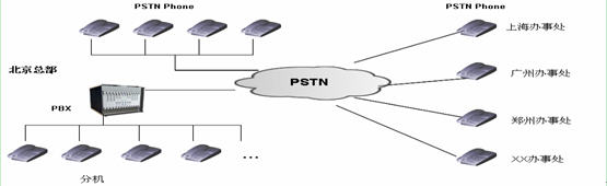 語音網(wǎng)絡(luò):總部部署有小型PBX,同時擁有部分直線PSTN電話,辦事處直接使用直線PSTN電話。