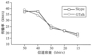 kbit/s時,GTalk發(fā)生了很明顯的變化,傳輸速率降低到了35 kbit/s。這個變化使得其PESQ MOS分?jǐn)?shù)與Skype相比有所提高,而Skype的傳輸速率則接近信道容量。當(dāng)信道容量變?yōu)?0