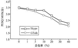MOS分?jǐn)?shù)比GTalk高,如圖8所示。在丟包率為5%時,Skype添加了過多的冗余,消耗了過多的網(wǎng)絡(luò)帶寬,而PESQ
