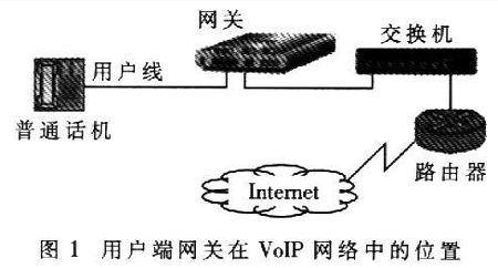 近年來(lái)隨著寬帶網(wǎng)絡(luò)和IP技術(shù)的日益發(fā)展,VoIP>(Volee over Internet Protoc01)技術(shù)的應(yīng)用越來(lái)越廣泛。網(wǎng)關(guān)是VoIP網(wǎng)絡(luò)中的重要設(shè)備,按照應(yīng)用領(lǐng)域可分為電信級(jí)網(wǎng)關(guān)和用戶端網(wǎng)關(guān)。用戶端網(wǎng)關(guān)設(shè)備主要應(yīng)用于小區(qū)和企業(yè),是連接終端電話和IP網(wǎng)絡(luò)的橋梁,主要功能是進(jìn)行語(yǔ)音編解碼、信令處理、VoIP協(xié)議處理和路由協(xié)議處理等。用戶端網(wǎng)關(guān)設(shè)備在VoIP網(wǎng)絡(luò)中的位置如圖1所示?梢钥闯,網(wǎng)關(guān)處于用戶電話線路部分的末端、IP網(wǎng)絡(luò)部分的起始端。