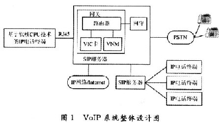 通過對國內(nèi)外VoIP技術的研究,要面向社會推廣價格低廉的IP電話業(yè)務,普通用戶的電話終端成本,運營商的設備、管理成本都是必須考慮的因素。因此,設計出了一個VoIP系統(tǒng)方案,如圖1所示。