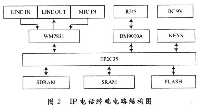 根據(jù)1P電話終端的硬件需求,為該終端配置了音頻接入口、音頻編解碼芯片WM8731;網(wǎng)絡接口芯片DM9000A;存儲器IC42S16400;主控制器EP2C35;直流電源9