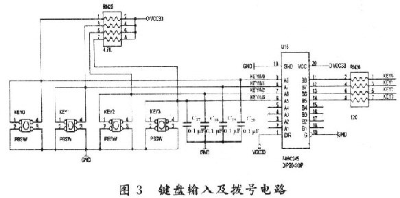 為實現(xiàn)IP電話與普通電話的通用性,該終端加入鍵盤模塊,按鍵開關KEY0~KEY9,KEY_X,KEY_Y,KEY_ON,KEY_OFF(其中,除KEY_ON和KEY_OFF是鎖閉式按鍵外,其余均為非鎖閉式按鍵)采用行列掃描式接法,加入了74HC245總線收發(fā)器作為緩沖器,電路如圖3所示(由于按鍵過多,圖中僅給出KEY0~KEY3電路)。