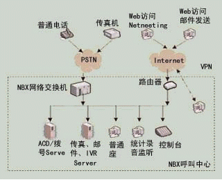 NBX呼叫中心是基于3Com公司NBX網(wǎng)絡電話交換機平臺構筑的、語音數(shù)據(jù)合一的呼叫中心。系統(tǒng)配置拓撲結(jié)構如圖3所示。