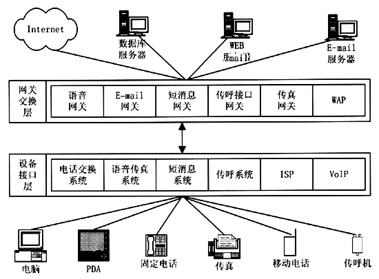 統(tǒng)一消息平臺集成了固定電話網(wǎng)、移動電話網(wǎng)和Internet網(wǎng)絡(luò)。目前,電話網(wǎng)和Internet網(wǎng)各自擁有獨(dú)立的網(wǎng)絡(luò)資源和信息服務(wù)領(lǐng)域,而這兩大網(wǎng)絡(luò)的用戶群存在著很大的交叉。電話的使用在中國已經(jīng)占有很高的普及率,傳統(tǒng)的160/168聲訊服務(wù)已經(jīng)成為中國百姓所熟悉的最具代表性的電話信息服務(wù),而Internet作為在中國剛剛興起的信息媒體,尚需要普通百姓逐漸認(rèn)識它、使用它。統(tǒng)一消息平臺將電話網(wǎng)和Internet網(wǎng)結(jié)合在一起,極大地?cái)U(kuò)大了兩大網(wǎng)絡(luò)各自的用戶群,電話用戶可以用電話或者傳真獲取Internet上的信息,電子郵件服務(wù)也可以不局限于Internet,而能對廣大的電話用戶開放。統(tǒng)一消息平臺為用戶帶來的是信息的方便、及時,使人們在任何時間、任何地點(diǎn)都能夠獲取需要的信息。