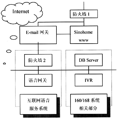 160/168聲訊平臺通過炎黃新星的網(wǎng)關(guān)產(chǎn)品與Internet相聯(lián),為了保證原有聲訊系統(tǒng)的安全性,在炎黃新星多終端信息訪問平臺的網(wǎng)絡(luò)結(jié)構(gòu)中增加了防火墻設(shè)置,原有的160/168聲訊平臺置于防火墻的后端,只與炎黃新星的語音合成網(wǎng)關(guān)存在通信聯(lián)系。